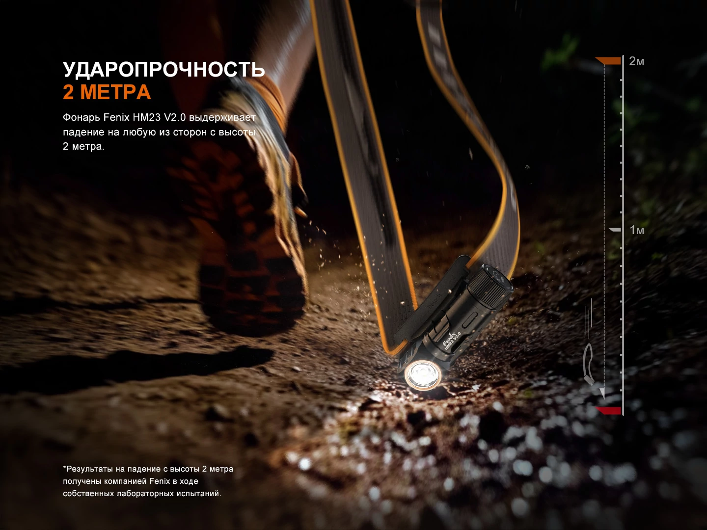 Помимо легкого и компактного дизайна, налобный фонарь обладает степенью защиты IP68 и полностью защищен от сильных водяных струй и пыли. В сочетании с ударопрочностью до 2 метров фонарь отлично подходит для интенсивного использования при различных видах активного отдыха или тренировок. Высокопроизводительные компоненты позволяют устройству работать в экстремальных условиях при температуре от -35° до 45°С.