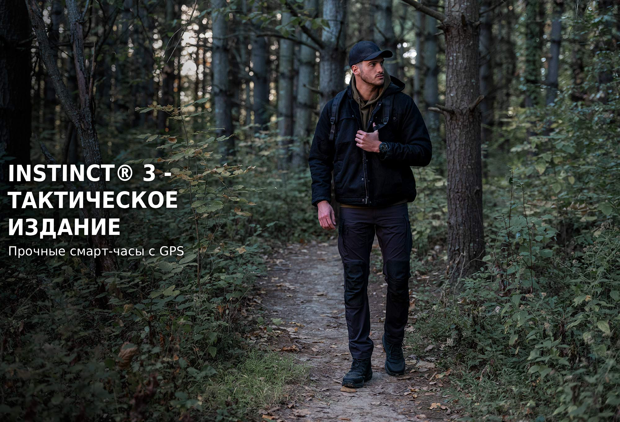 Часы Instinct 3 Tactical Edition имеют невероятно прочный 50-миллиметровый корпус из армированного волокном полимера и металлический безель. Они водонепроницаемы до 10 атм. Часы соответствуют военным стандартам США по температуре, ударопрочности и водонепроницаемости.
